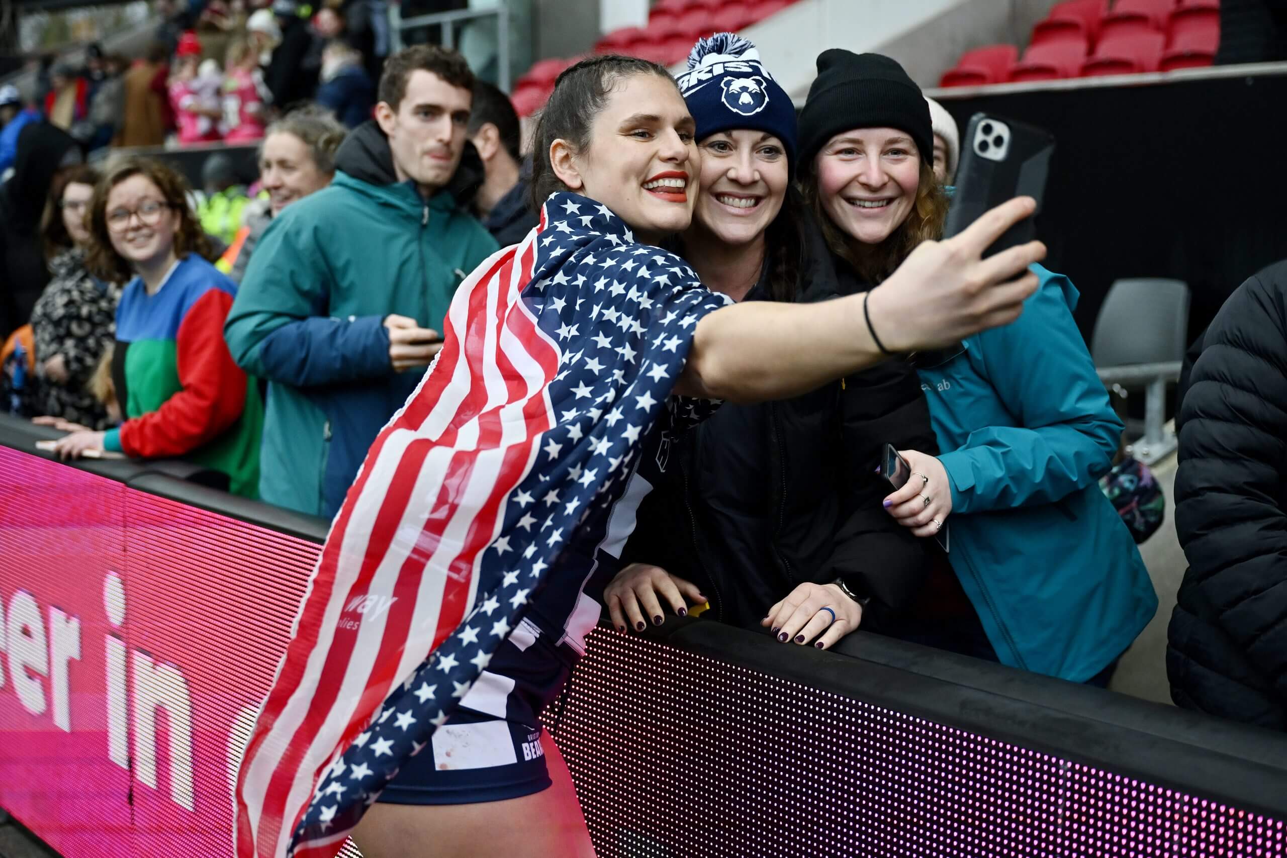 Maher takes a selfie with fans after making her debut for Bristol Bears (Dan Mullan/Getty Images)